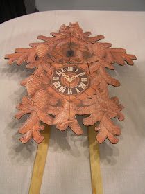 A double door 4.5 inches wide and high was cut into the area above the clock face. The hinge areas were reinforced with clear plastic packing tape. The cuts for the door were widened a bit to eliminate friction on the door edges. A puppet bird can push the doors open, and when the bird withdraws, the doors are pulled closed by a weighted string.